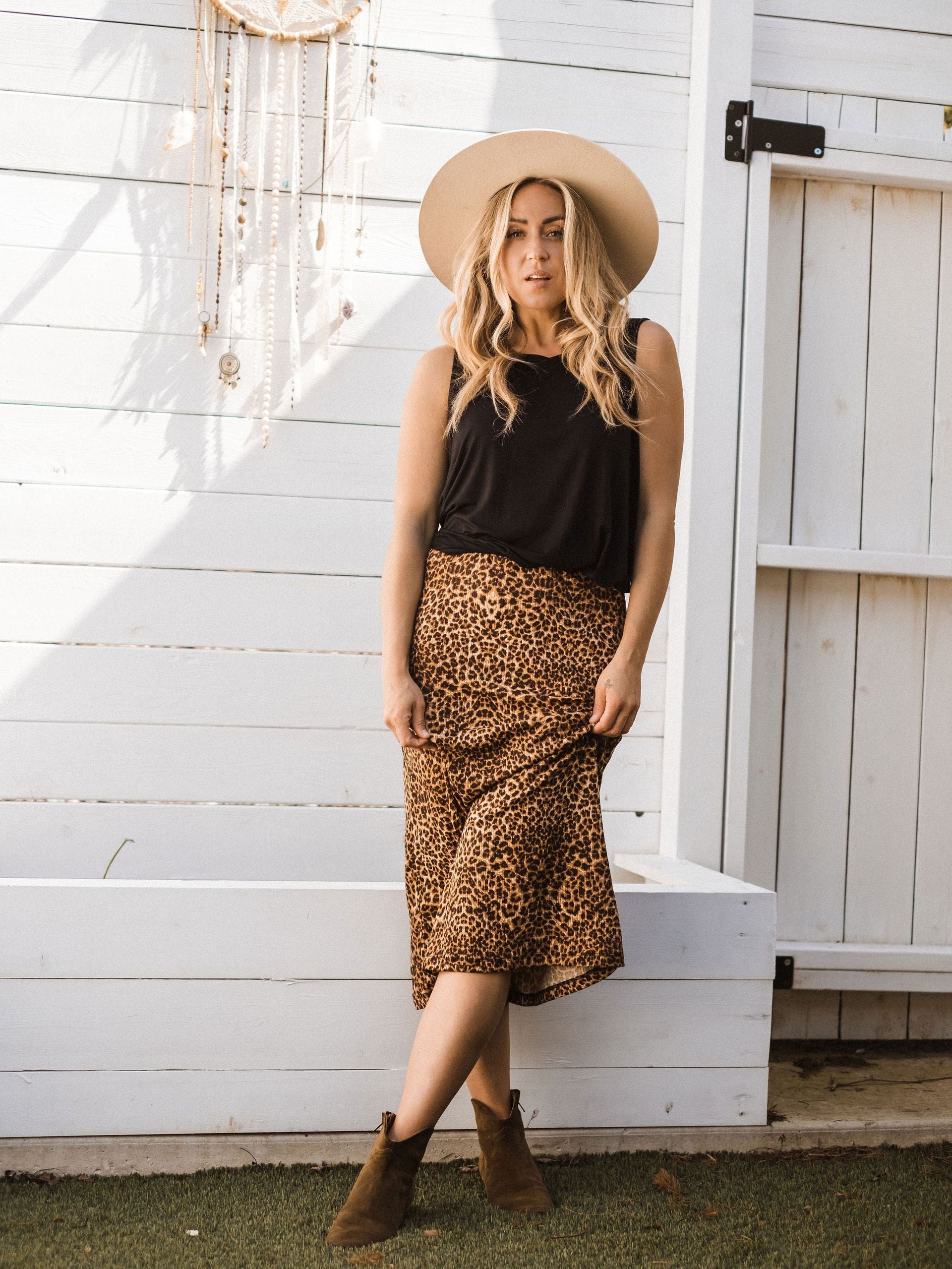Dress this midi length skirt up with a pair of booties, or down with a pair of sneakers! Both are right on trend! Super flattering wide waistband for ultimate comfort.