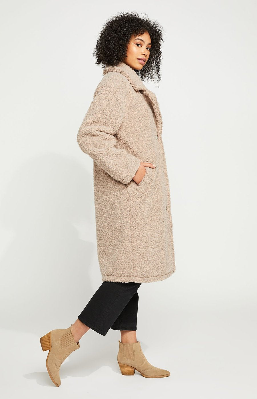 Made of a super soft faux shearling, the Hoxton coat (in Mink) is an instant showstopper. The Hoxton features a longer length, relaxed silhouette, welt pockets, and comes fully lined.